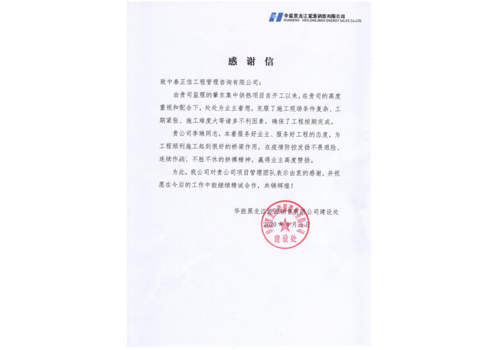 2020年肇东集中供热项目感谢信