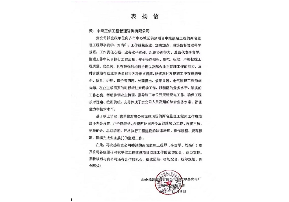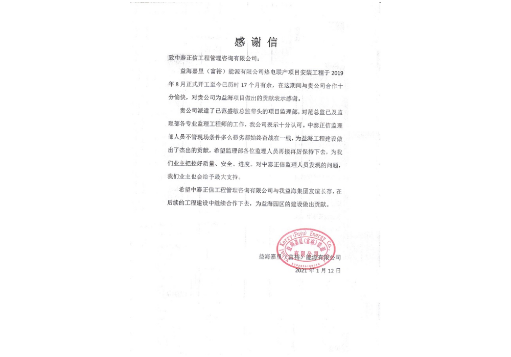 2021年益海嘉里热电联产项目感谢信